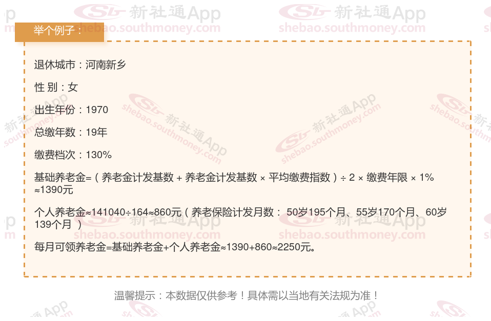 笔友沈某退休城市在河南新乡,性别:女,出生年份:1970,总缴年数19年,缴费档次:130%,新社通app养老金计算器所得:
