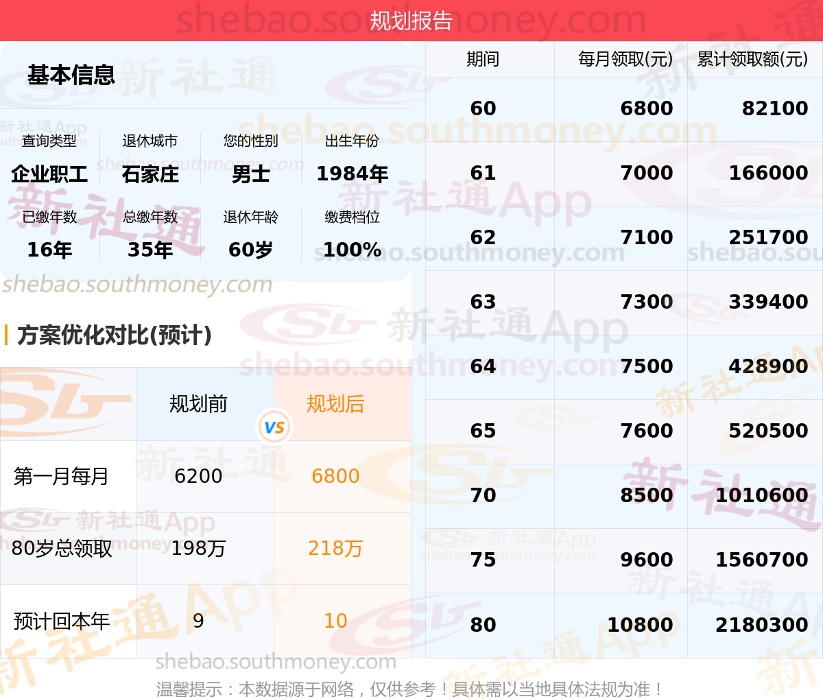 规划前:60岁第一个月约领6200元,新社通APP-养老金规划后:60岁第一个月约领6800元