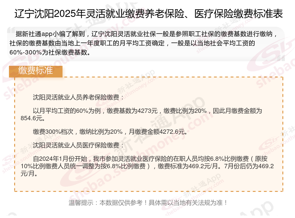据新社通app数据显示,辽宁沈阳灵活就业养老保险缴费基数2024-2025年最新标准如下: