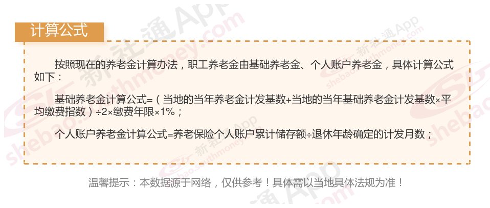 个人养老金=养老保险个人账户累计储存额÷退休年龄确定的计发月数(养老保险计发月数:50岁195个月、55岁170个月、60岁139个月)≈1100元