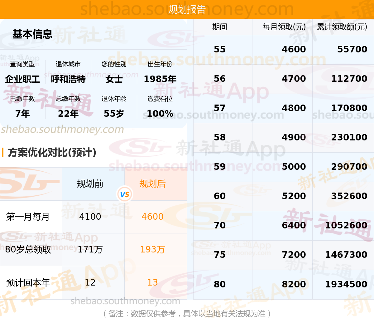 规划前:55岁第一个月约领4100元,新社通APP-养老金规划后:55岁第一个月约领4600元