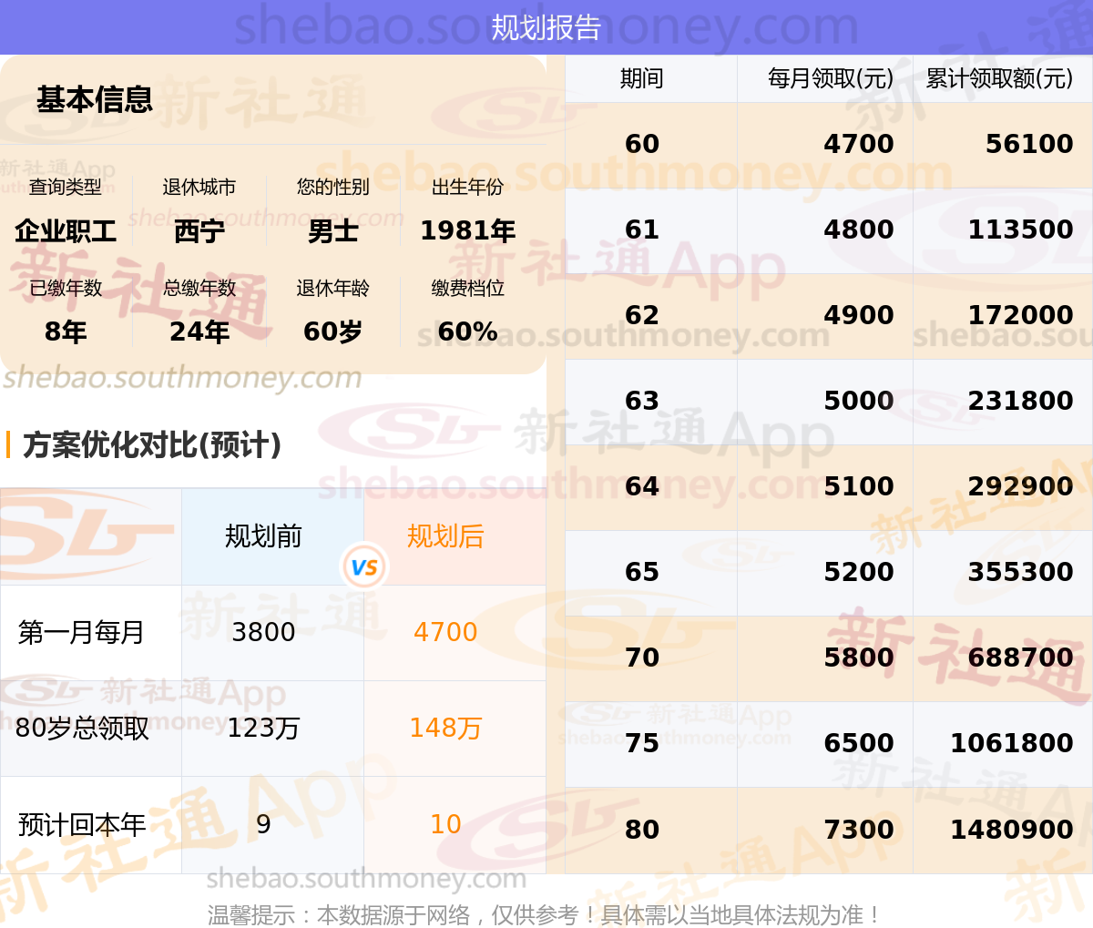 规划前:60岁约领3800元,新社通APP-养老金规划后:60岁约领4700元
