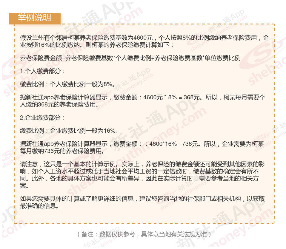 据新社通app显示,兰州企业职工养老保险的缴费基数为:4600元。