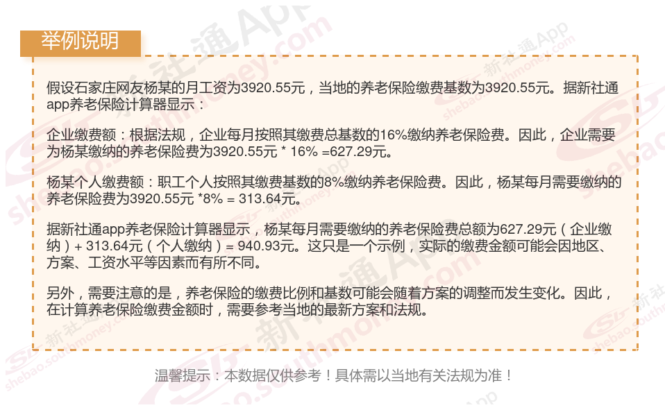 据新社通app显示,石家庄2024-2025企业职工养老保险的缴费基数为:3920.55元。