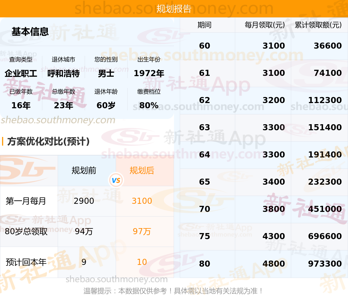 规划前:60岁第一个月约领2900元,新社通APP-养老金规划后:60岁第一个月约领3100元