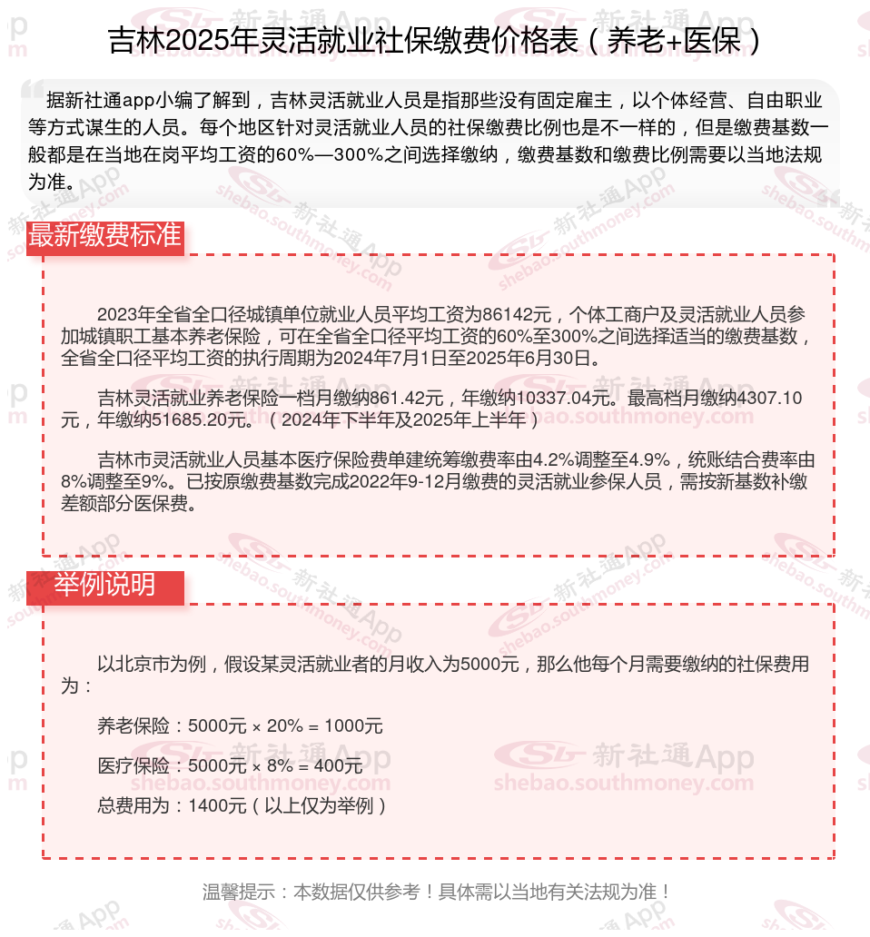 据新社通app数据显示,吉林灵活就业养老保险缴费基数2024-2025年最新标准如下: