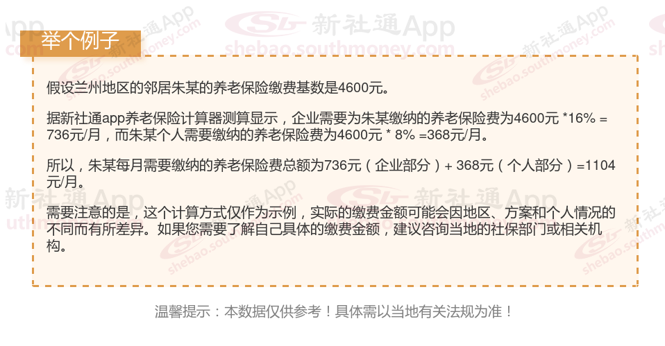 据新社通app显示,兰州职工养老保险最低缴费基数为:4600元;单位和个人的缴费比例分别为:16%、8%;