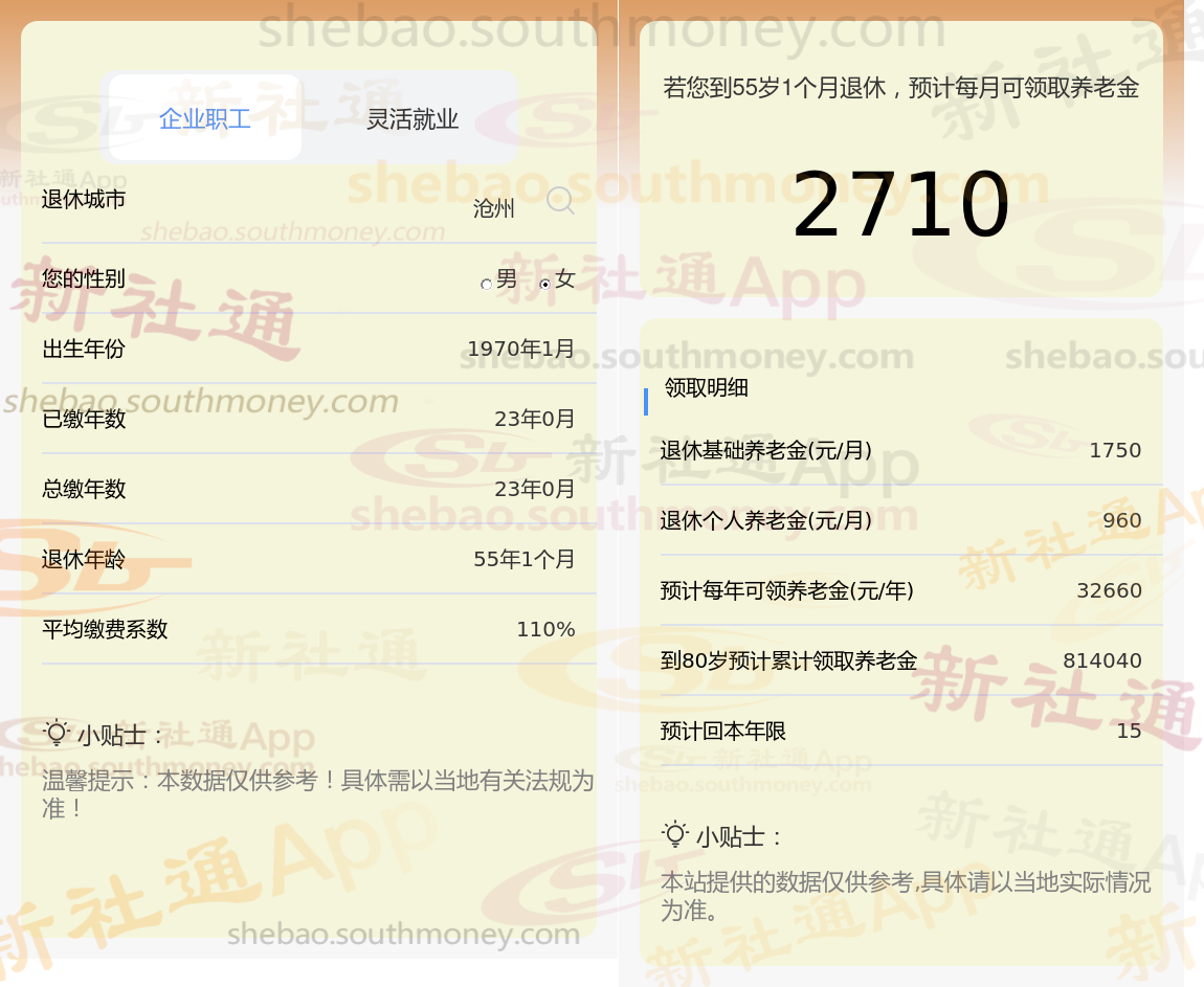 个人档案:女性,1970年出生,沧州退休职工,社保缴费23载,档次110%。