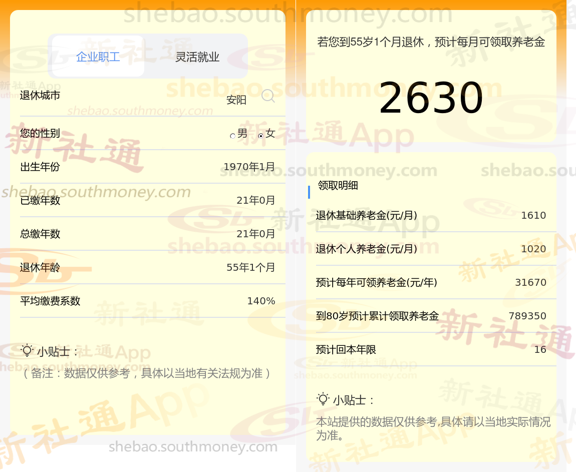 一名安阳女性退休人员的概况:她出生于1970年,作为职工已缴纳社保满21年,且缴费档次达到140%。