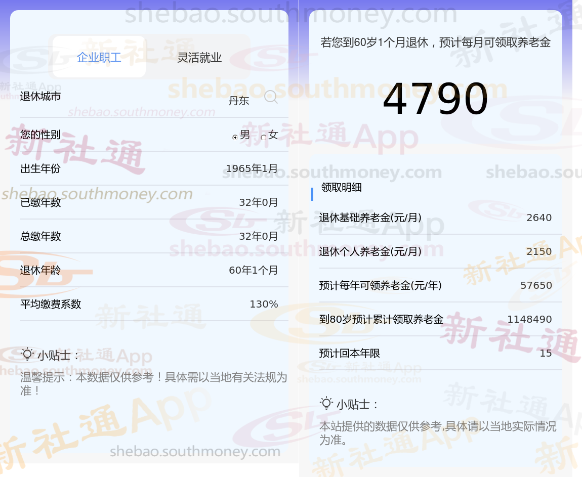 社保按130%档次缴费的康某,丹东城市退休,出生于1965年,工龄32年,男性。岁月流转,他终于迎来了自己的退休年龄。根据新社通app养老金在线计算器计算所得: