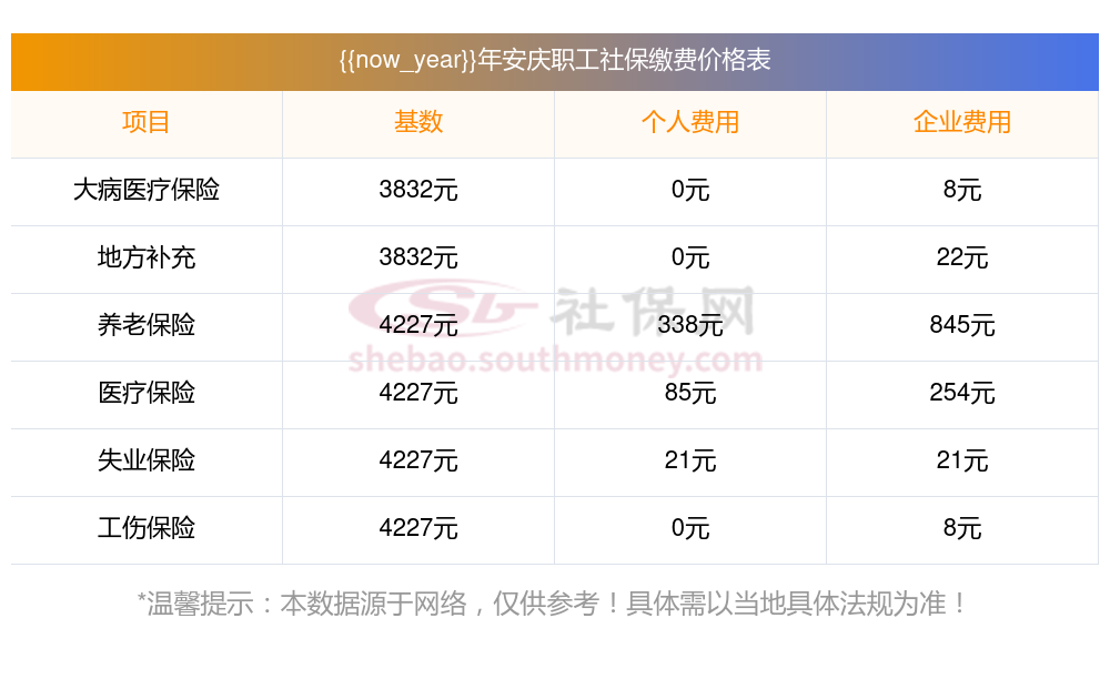 在职员工五险一个月交多少钱 公司加个人是多少?下表是2024-2025年安庆社保费用明细参考,新社通app-社保缴费查询工具提供的最新数据如下: