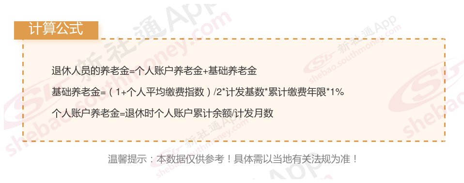 基础养老金:其计算公式为(全省上年度在岗职工月平均工资+本人指数化月平均缴费工资)÷2×缴费年限×1%。其中,本人指数化月平均缴费工资=全省上年度在岗职工月平均工资×本人平均缴费指数(本人平均缴费指数最高为300%,最低为60%,指数在0.6~3之间)。