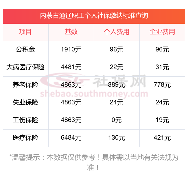 2025年内蒙古通辽五险缴费标准是多少,2025年内蒙古通辽社保缴费多少钱?下表是2025年内蒙古通辽社保费用明细参考,新社通app-社保缴费查询工具提供的最新数据如下:
