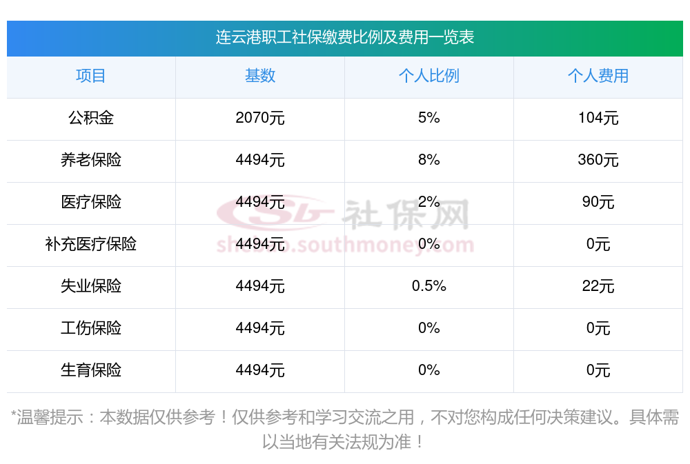 2025年连云港社保缴纳比例,2025年连云港社保缴费多少钱?下表是2024-2025年连云港社保费用明细参考,新社通app-社保缴费查询工具提供的最新数据如下: