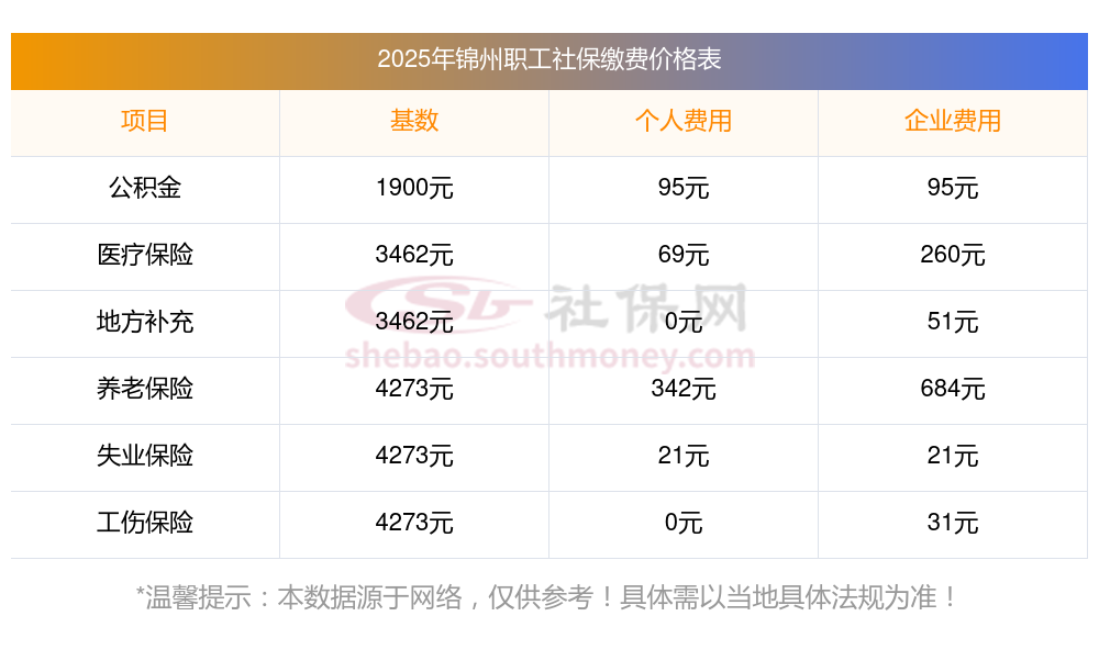 2025年锦州社保缴费价格,2025年锦州社保缴费多少钱?下表是2025年锦州社保费用明细参考,新社通app-社保缴费查询工具提供的最新数据如下: