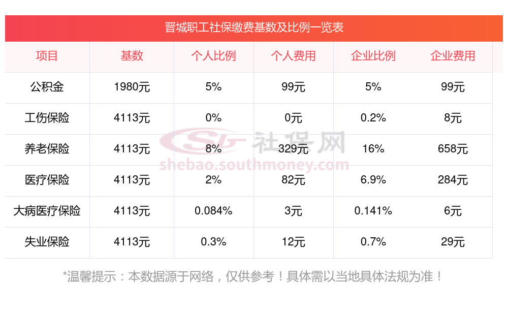 2025年晋城5险缴费标准,2025年晋城社保缴费多少钱?下表是2025年晋城社保费用明细参考,新社通app-社保缴费查询工具提供的最新数据如下: