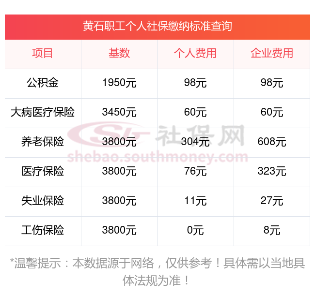 2025年黄石社保缴费价格,2025年黄石社保缴费多少钱?下表是2025年黄石社保费用明细参考,新社通app-社保缴费查询工具提供的最新数据如下: