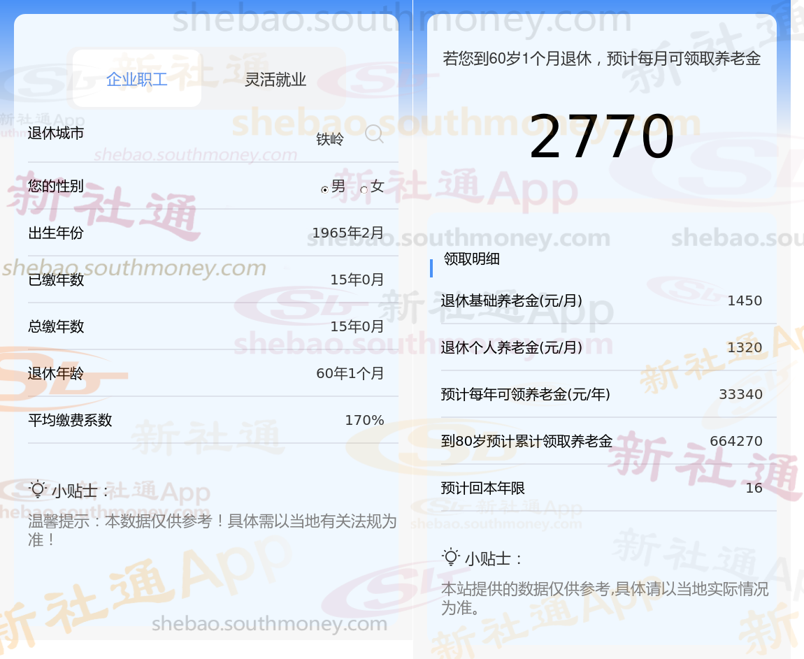 退休城市:铁岭,性别:男,出生年份:1965,总缴年数15年,缴费档次:170%,新社通app养老金计算器所得:
