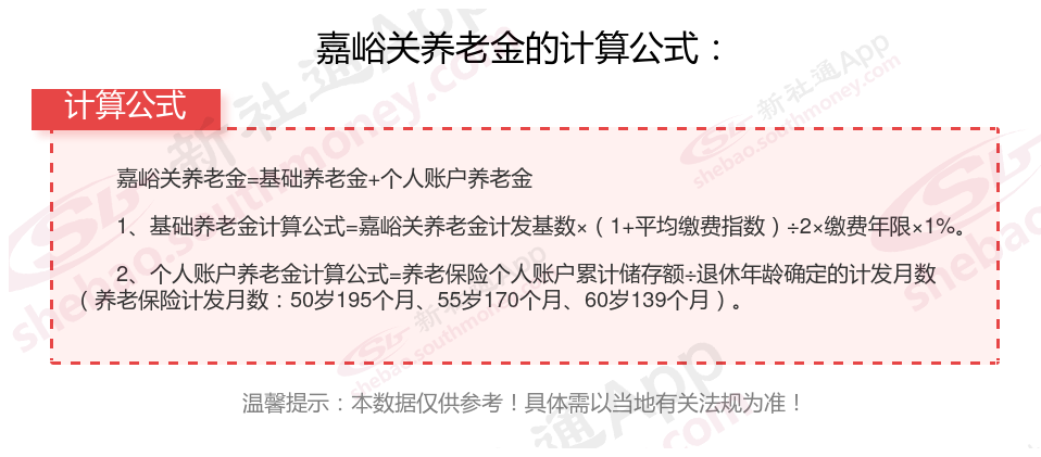 基础养老金=(退休上一年嘉峪关在岗职工月平均工资+退休上一年嘉峪关在岗职工月平均工资×个人平均缴费工资指数)÷2×累计缴费年限(含视为缴费年限)×1%。