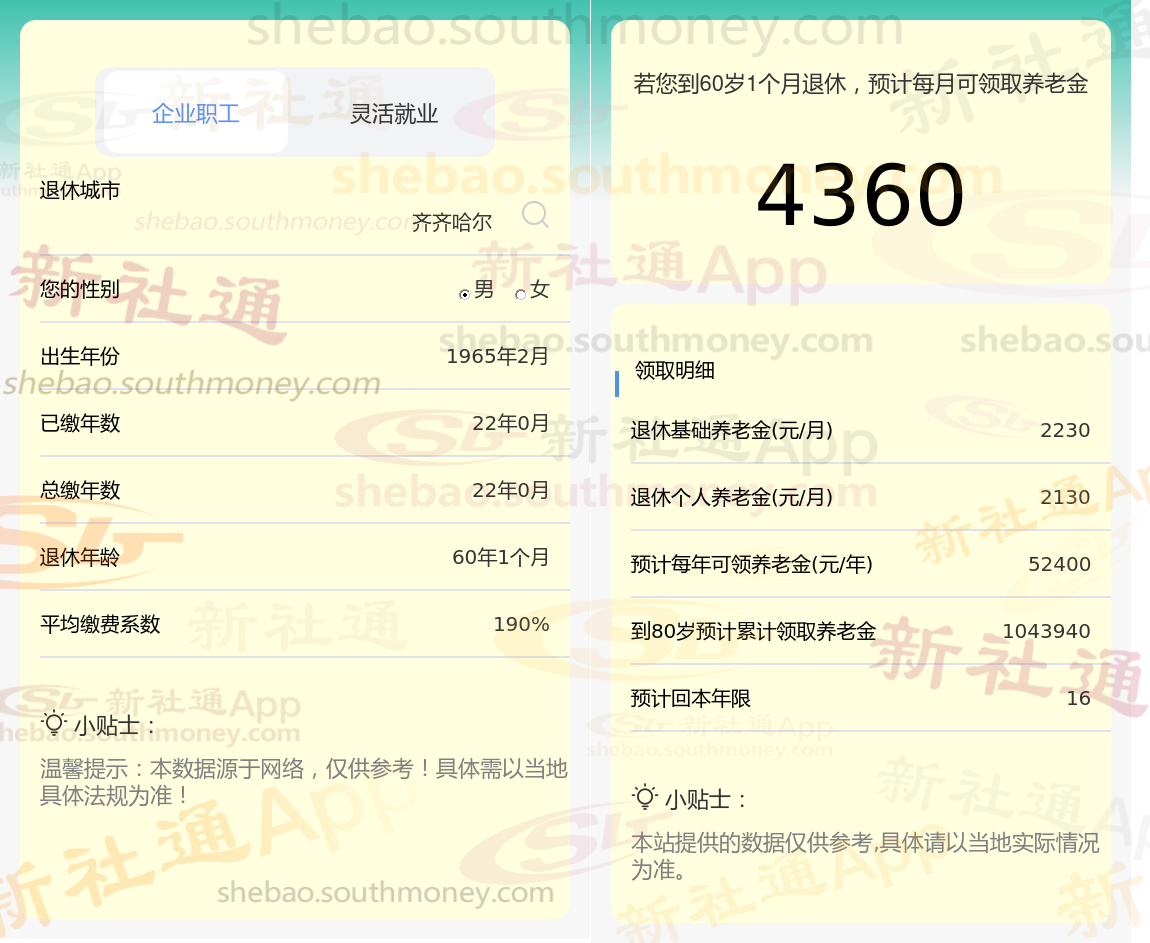 退休城市:齐齐哈尔,性别:男,出生年份:1965,总缴年数22年,缴费档次:190%,新社通app养老金计算器所得: