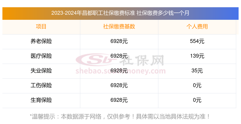 昌都2025年养老保险缴费标准是多少?下表是2025年昌都社保费用明细参考,新社通app-社保缴费查询工具提供的最新数据如下: