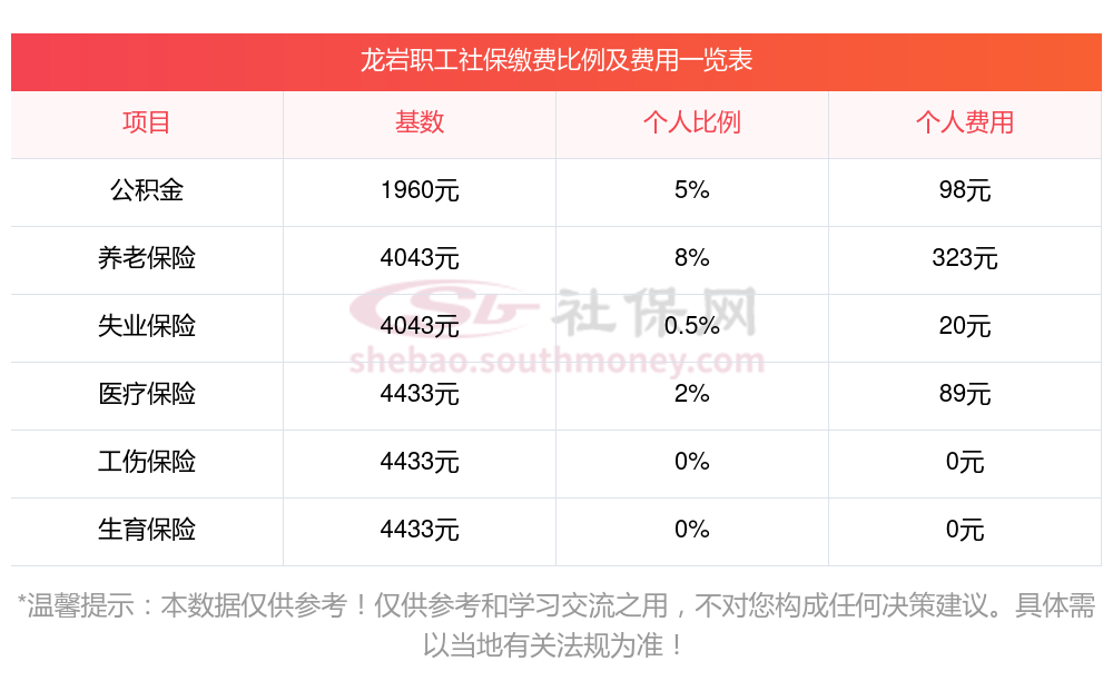 2025年龙岩5险缴费标准,2025年龙岩社保缴费多少钱?下表是2025年龙岩社保费用明细参考,新社通app-社保缴费查询工具提供的最新数据如下:
