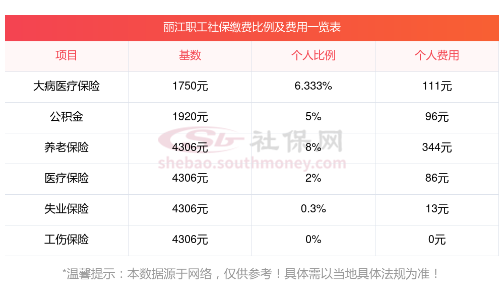 2025年丽江社保缴费最低基数及个人和单位具体是多少钱?下表是2025年丽江社保费用明细参考,新社通app-社保缴费查询工具提供的最新数据如下: