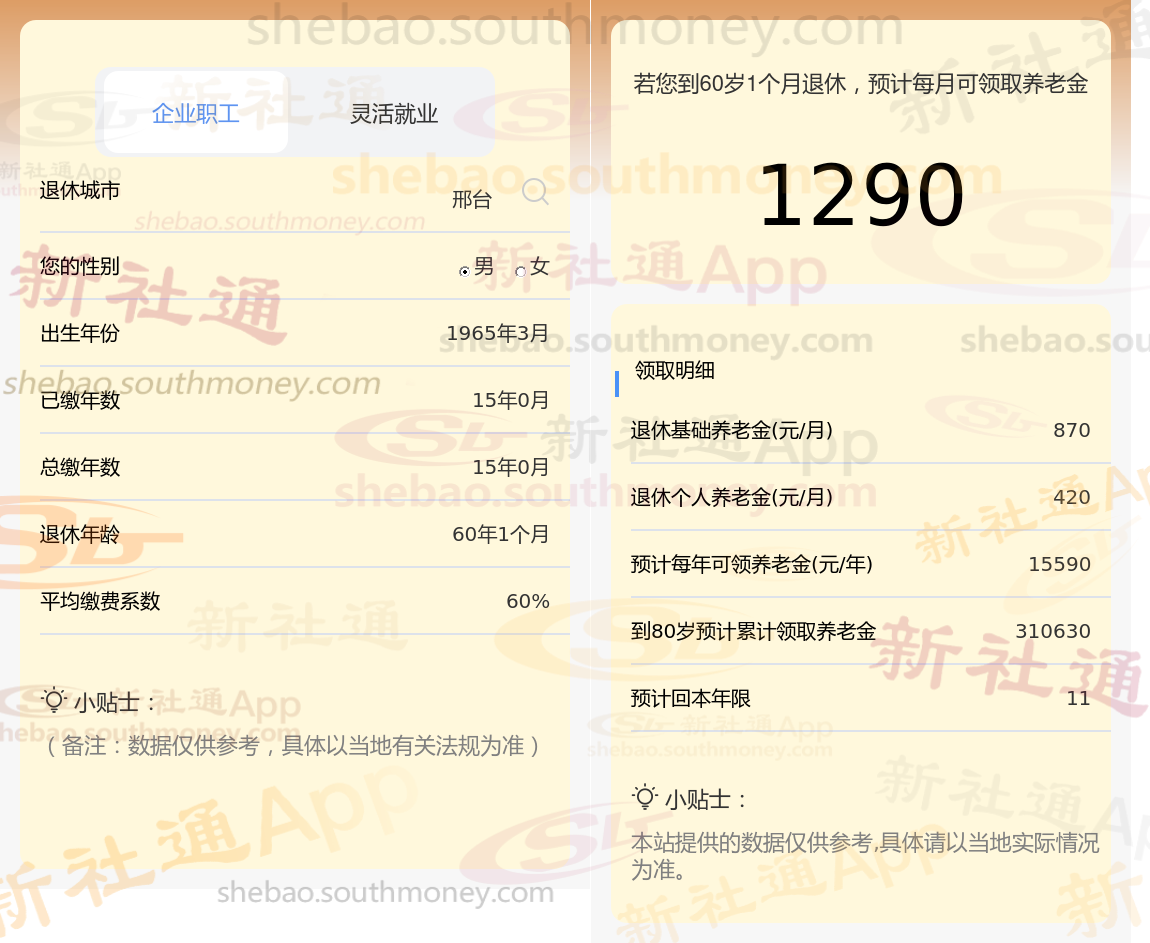 退休城市:邢台,性别:男,出生年份:1965,总缴年数15年,缴费档次:60%,新社通app养老金计算器所得: