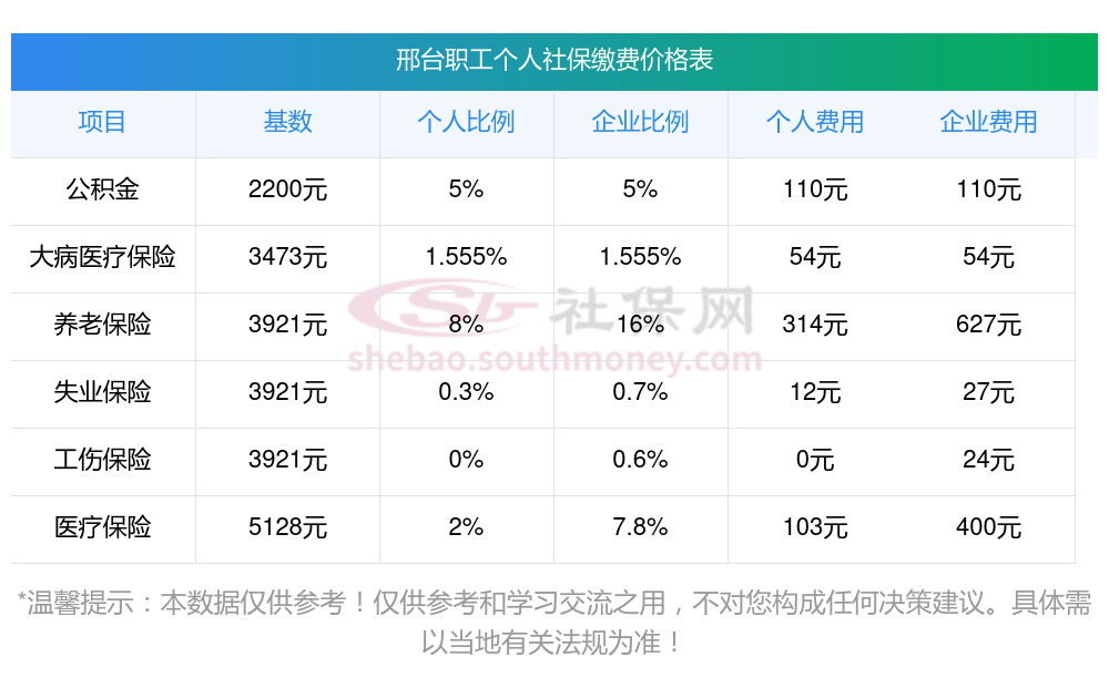 2025年邢台社保缴费最低基数及个人和单位具体是多少钱?下表是2025年邢台社保费用明细参考,新社通app-社保缴费查询工具提供的最新数据如下:
