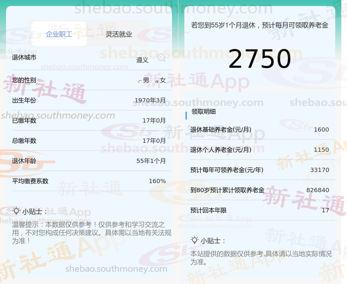 退休城市:遵义,性别:女,出生年份:1970,总缴年数17年,缴费档次:160%,新社通app养老金计算器所得: