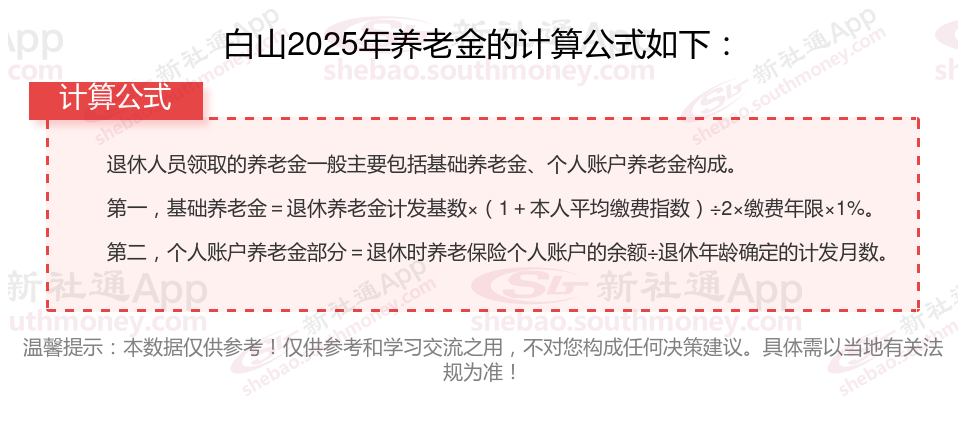退休城市:白山,性别:男,出生年份:1965,总缴年数34年,缴费档次:120%,新社通app养老金计算器所得: