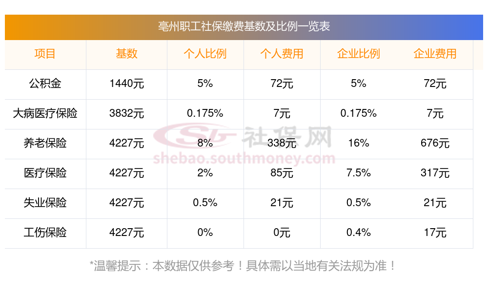 2025年亳州五险缴费标准是多少,2025年亳州社保缴费多少钱?下表是2025年亳州社保费用明细参考,新社通app-社保缴费查询工具提供的最新数据如下: