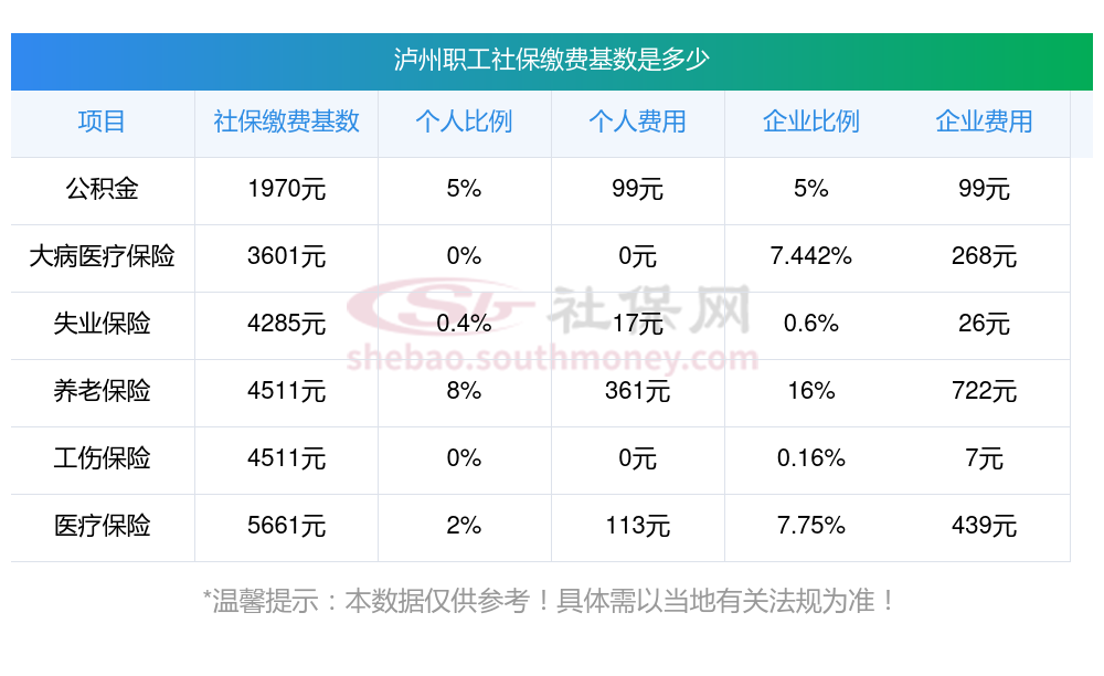 2025年泸州社保缴费价格,2025年泸州社保缴费多少钱?下表是2025年泸州社保费用明细参考,新社通app-社保缴费查询工具提供的最新数据如下:
