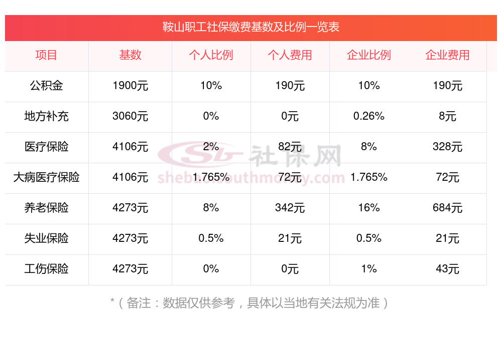 2025年鞍山五险缴费标准是多少,2025年鞍山社保缴费多少钱?下表是2025年鞍山社保费用明细参考,新社通app-社保缴费查询工具提供的最新数据如下: