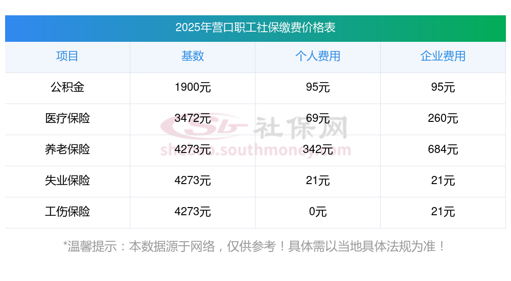 2025社保交多少钱?下表是2025年营口社保费用明细参考,新社通app-社保缴费查询工具提供的最新数据如下: