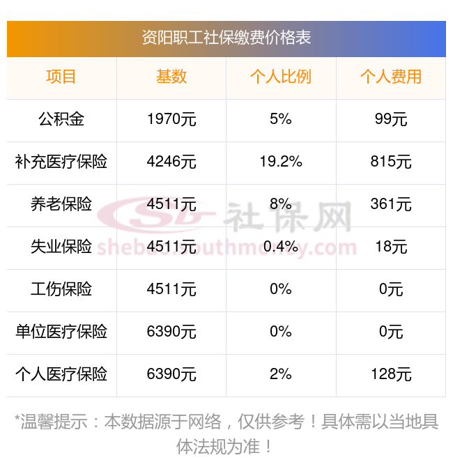 2025年资阳社保缴费最低基数及个人和单位具体是多少钱?下表是2025年资阳社保费用明细参考,新社通app-社保缴费查询工具提供的最新数据如下: