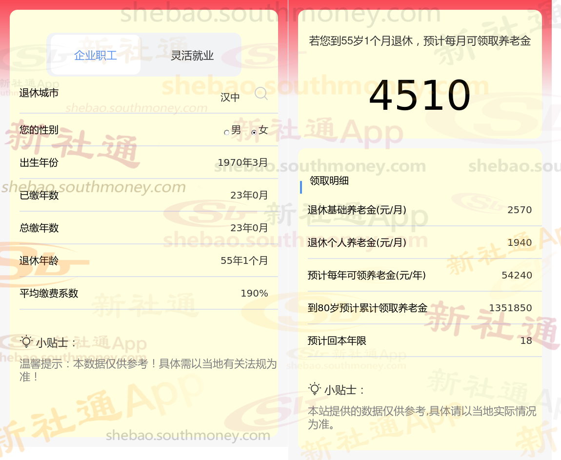 退休城市:汉中,性别:女,出生年份:1970,总缴年数23年,缴费档次:190%,新社通app养老金计算器所得: