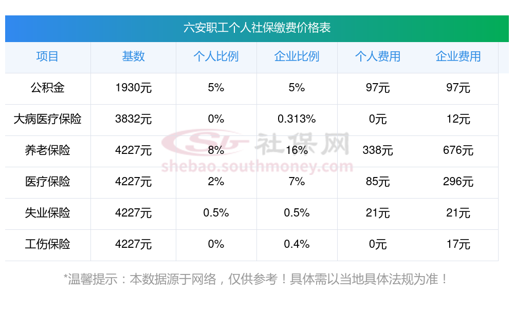 六安2025年养老保险缴费标准是多少?下表是2025年六安社保费用明细参考,新社通app-社保缴费查询工具提供的最新数据如下: