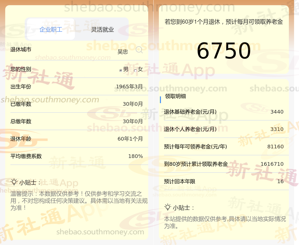 个人档案:男性,1965年出生,吴忠退休职工,社保缴费30载,档次180%。
