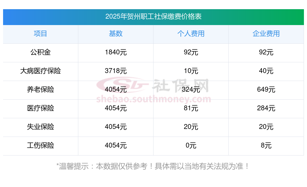 2025年贺州五险缴费标准是多少,2025年贺州社保缴费多少钱?下表是2025年贺州社保费用明细参考,新社通app-社保缴费查询工具提供的最新数据如下: