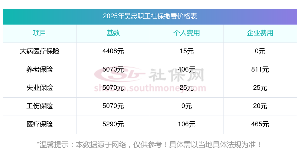 五险一金扣多少?吴忠五险一金扣多少钱?下表是2024-2025年吴忠社保费用明细参考,新社通app-社保缴费查询工具提供的最新数据如下: