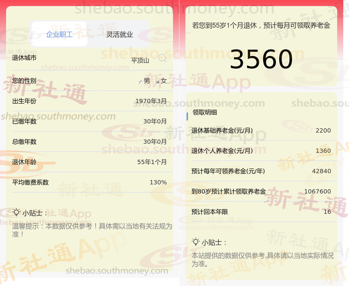 退休城市:平顶山,性别:女,出生年份:1970,总缴年数30年,缴费档次:130%,新社通app养老金计算器所得: