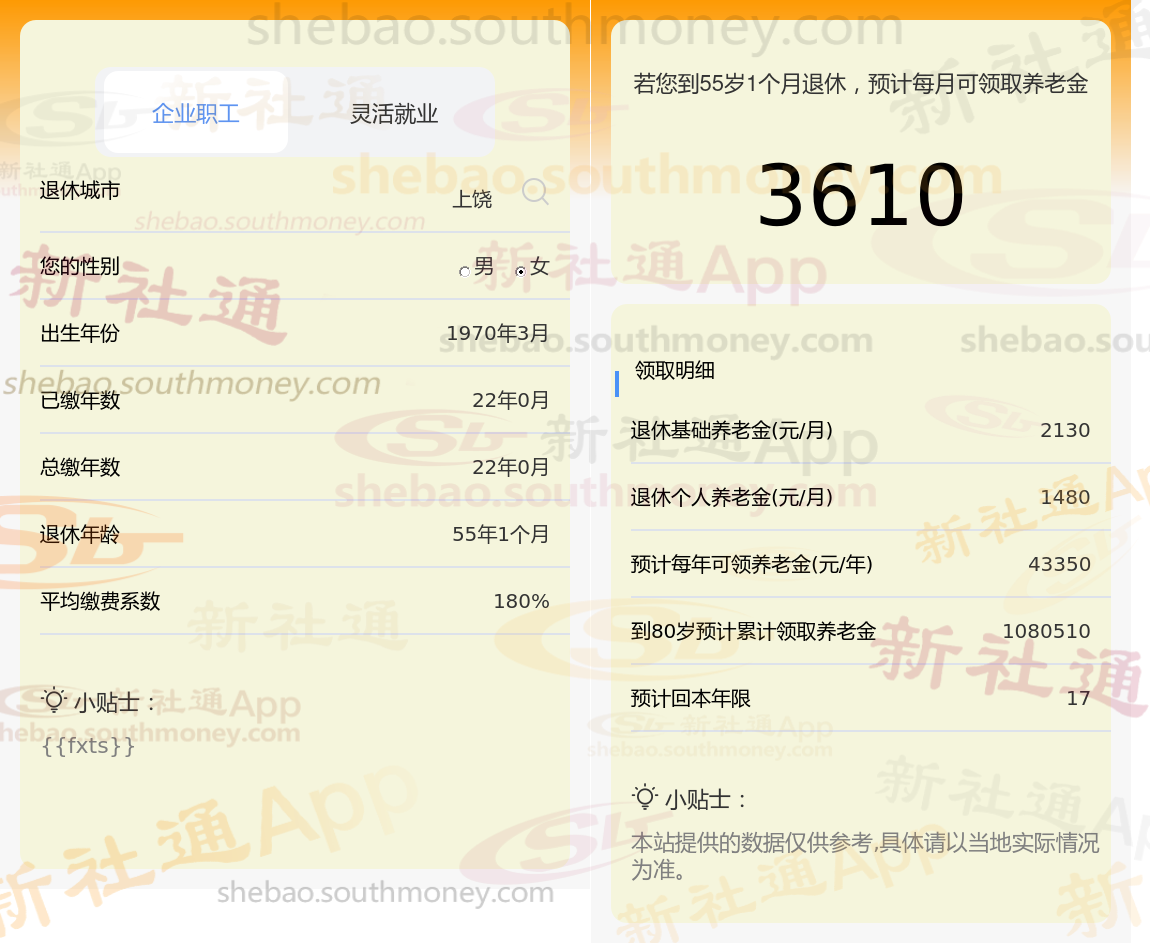个人基础信息:女性,1970年出生,上饶退休人士,拥有22年的缴费年限,缴费档次为180%。