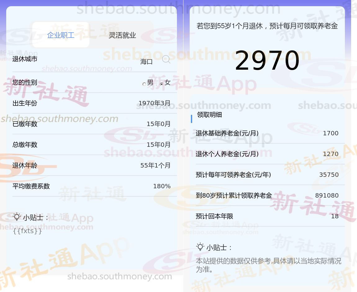 亲戚谢某退休城市在海口,性别:女,出生年份:1970,总缴年数15年,缴费档次:180%,新社通app养老金计算器所得: