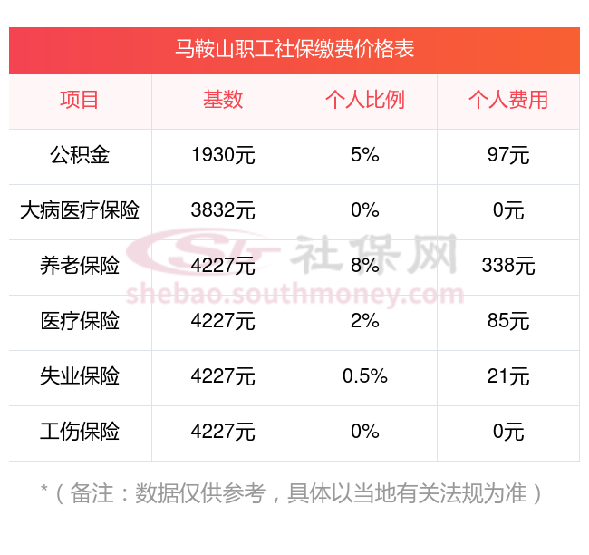 2025年马鞍山社保缴费最低基数及个人和单位具体是多少钱?下表是2025年马鞍山社保费用明细参考,新社通app-社保缴费查询工具提供的最新数据如下: