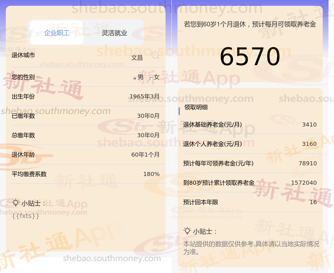 退休城市:文昌,性别:男,出生年份:1965,总缴年数30年,缴费档次:180%,新社通app养老金计算器所得: