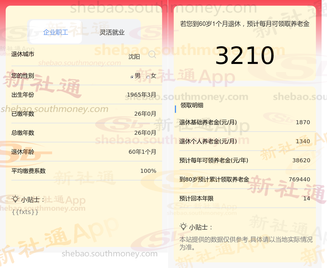 退休城市:沈阳,性别:男,出生年份:1965,总缴年数26年,缴费档次:100%,新社通app养老金计算器所得: