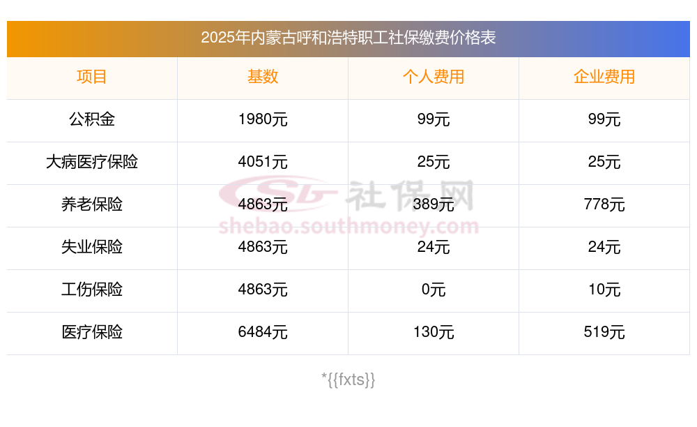 内蒙古呼和浩特2025年养老保险缴费标准是多少?下表是2025年内蒙古呼和浩特社保费用明细参考,新社通app-社保缴费查询工具提供的最新数据如下: