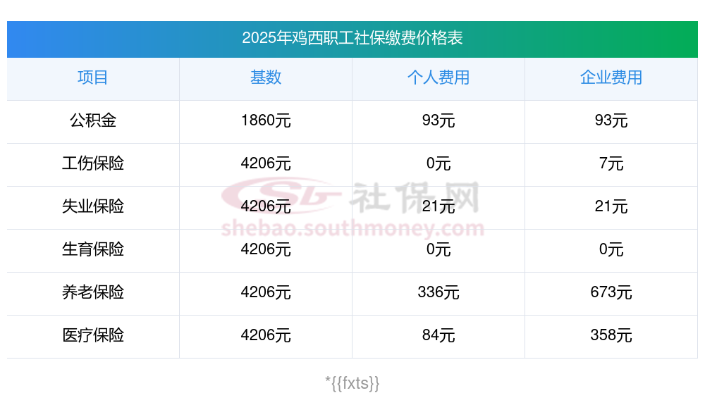 2025年鸡西社保缴费最低基数及个人和单位具体是多少钱?下表是2025年鸡西社保费用明细参考,新社通app-社保缴费查询工具提供的最新数据如下: