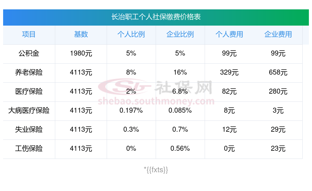 2025年长治社保缴费最低基数及个人和单位具体是多少钱?下表是2025年长治社保费用明细参考,新社通app-社保缴费查询工具提供的最新数据如下: